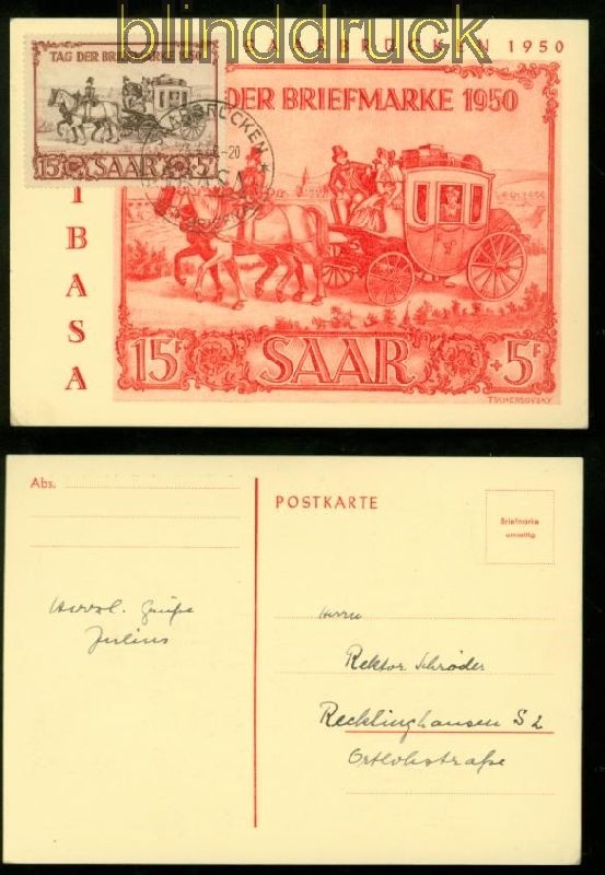 Saarland Mi # 291 Tag der Briefmarke Maximumkarte SSt. FDC Internationale Briefmarkenausstellung IBASA, Saarbrücken Tag der Briefmarke aud seltener Maximumkarte entwertet mit Sonderstempel SSt. vom Ersttag Erhaltung siehe Scan