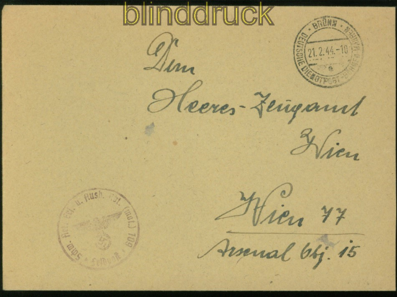 Deutsche Dienstport Böhmen und Mähren Feldpost-Fernbrief aus Brünn 21.2.1944 nach Wien Briefstempel Schw. Art. Ers. u. Ausb. Abt. (mot) 109 Erhaltung siehe Scan