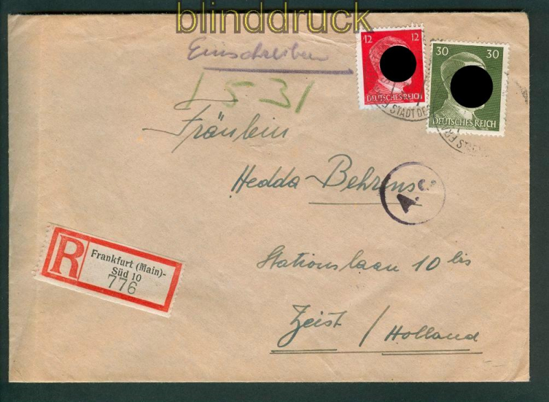 dt. Reich Auslands-Zensur-R-Brief Frankfurt 1943 (25482)
