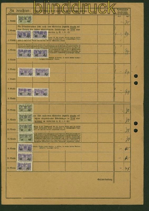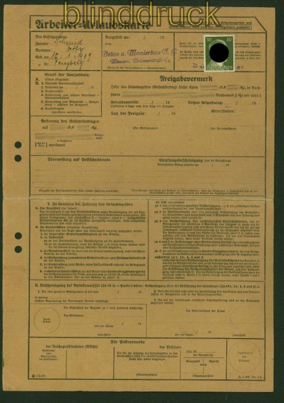 Deutsches Reich Mi # 794 auf Arbeiter-Urlaubskarte München 1942 Arbeiter Urlaubskarte der Beton- und Monierbau mit 30 Pfennig Dauerserie als verklebte Gebühr rückseitig Urlaubsmarken verklebt. Erhaltung siehe Scan