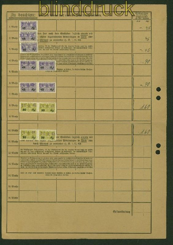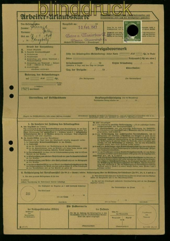 Deutsches Reich Mi # 794 auf Arbeiter-Urlaubskarte München 1943 Arbeiter Urlaubskarte der Beton- und Monierbau mit 30 Pfennig Dauerserie als verklebte Gebühr rückseitig Urlaubsmarken verklebt. Erhaltung siehe Scan