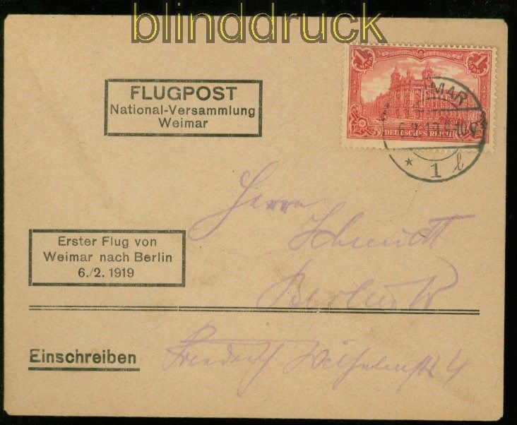 Deutsches Reich Mi # 94 A II EF auf Luftpostbrief Weimar 1919 1 Mark Germania Kriegsdruck mit Zähnung 26:17 auf Luftpostbrief aus Weimar 6.2.1919 nach Berlin Erstflug Weimar - Berlin Ankunftsstempel 1 Zahn kurz Erhaltung siehe Scan