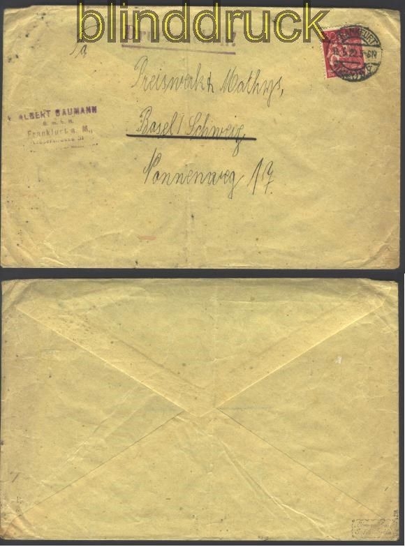 dt. Reich portogerechte EF Mi # 166 80 Pfg. Bergarbeiter Wasserzeichen 1 auf Auslands-Drucksache aus Frankfurt 12.5.1922 nach Basel/Schweiz Katalogwert: 170,00 Euro geprüft Infla Berlin Mitte senkrechter Bug Marke kleiner Zahnfehler Erhaltung siehe Scan