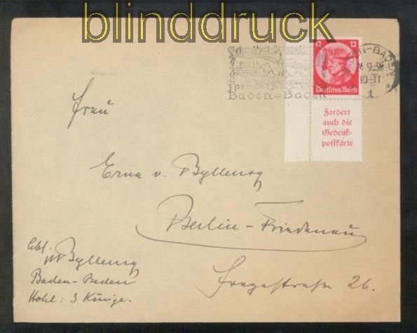 Deutsches Reich Zusammendrucke Mi # S 104 EF auf Fernbrief Baden-Baden 1934 12 Pfennig Fredericus senkrechter Zusammendruck mit Reklamefeld fordert auch die Gedenkpostkarte portogerecht auf Fernbrief aus Baden-Baden 24.9.1934 nach Berlin Erhaltung siehe Scan