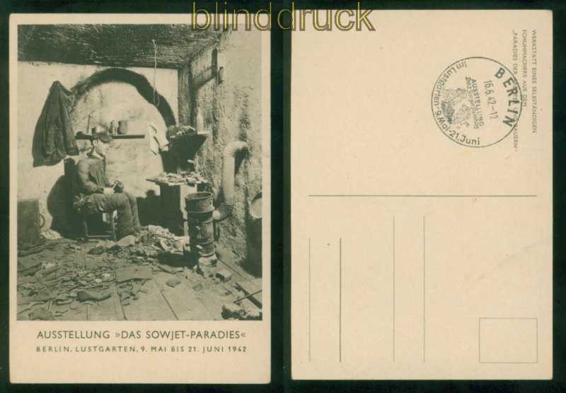 Deutsches Reich Propaganda-Karte Ausstellung Das Sowjet-Paradies Werkstatt eines Schumachers Sonderstempel Ausstellung Das Sowjet-Paradies Berlin Lustgarten 9. Mai bis 21. Juni 1942 Werkstatt eines selbständigen Schumachers aus dem Paradies der Arbeiter und Bauern Karte nicht adressiert mit abgeschlagegen Ausstellungs-Sonderstempel SSt. Erhaltung siehe Scan