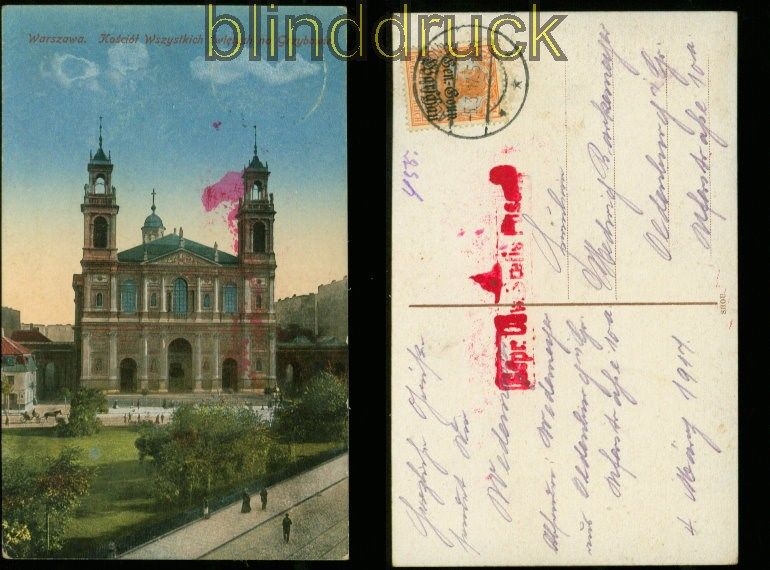 Deutsches Reich Post in Polen Mi # 9 EF auf AK Warschau Zensur Posen 7 1/2 Pfg. Germania mit Aufdruck Gen.-Gouv. Warschau auf farb-AK Warschau Kosciot Wszystkich swirtych na Grzybowie mit R1 in rot: Gepr. Übw. Stelle Posen Karte gelaufen aus Alexandrowo 5.3.1917 nach Oldenburg Erhaltung siehe Scan