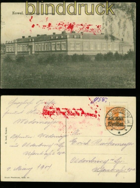 Deutsches Reich Post in Polen Mi # 9 EF auf AK Kowel Zensur Posen 7 1/2 Pfg. Germania mit Aufdruck Gen.-Gouv. Warschau auf sw-AK Kowel mit R1 in rot: Gepr. Übw. Stelle Posen Karte gelaufen aus Alexandrowo 4.3.1917 nach Oldenburg Erhaltung siehe Scan