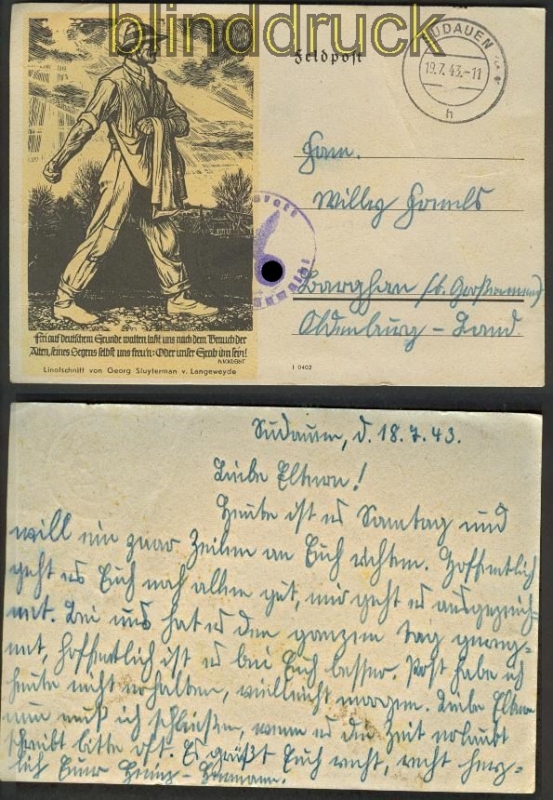 Deutsches Reich illustrierte Feldpostkarte mit Spruch Heinrich von KleistKarte gelaufen mit Feldpost aus Südauen 19.7.1943 nach Oldenburgmit BriefstempelErhaltung siehe Scan1310