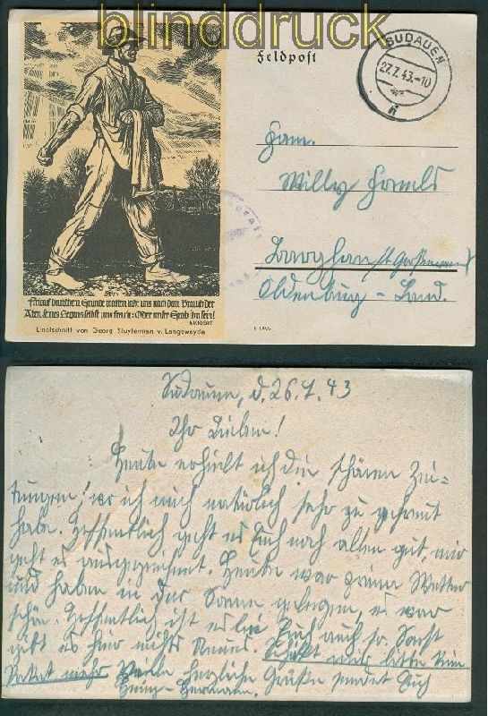 Deutsches Reich illustrierte Feldpostkarte mit Spruch Heinrich von KleistKarte gelaufen mit Feldpost aus Südauen 27.7.1943 nach Oldenburgmit BriefstempelErhaltung siehe Scan1310
