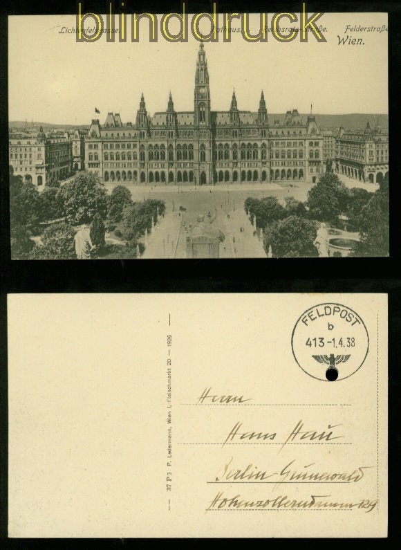 Feldpost Österreich 1.4.1938 auf sw-AK Wien Deutsche Feldpost in Österreich 1938 mit Feldpost-Normstempel 413 vom 01.04.1938 auf Ansichtskarte Wien PLichtenfelsgasse, Rathaus, Reichsrats-Straße und Felderstraße 1.4.1938 nach Berlin-Grunewald Erhaltung siehe Scan