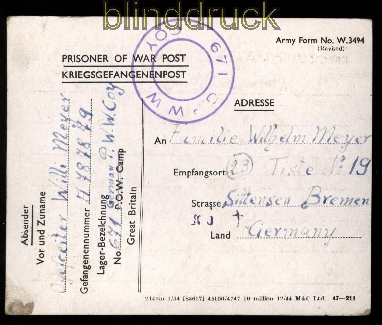 Deutsches Reich POW Kgf-Postkarte 671 G.P. W.W. Coy 31.12.1945 Kriegsgefangenenpost aus England Lager671 German P.W.W. Coy Karte geschrieben 31.12.1945 nach Sittensen bei Bremen Erhaltung siehe Scan
