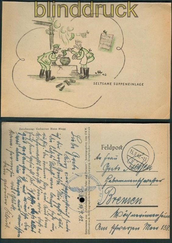 Deutsches Reich Feldpost 2. Weltkrieg Schmuck-Feldpostkarte 1942 Fliegertruppe # 12 Seltsame Suppeneinlage Zeichnung Gefreiter Magg entnommen aus: Soldatenblätter für Feder und Freizeit Briestempel Kraftfahrausbildungsabteilung der Fliegertruppe Nr. 12 Karte gelaufen mit stummen Stempel vom 15.9.1942 nach Bremen Erhaltung siehe Scan