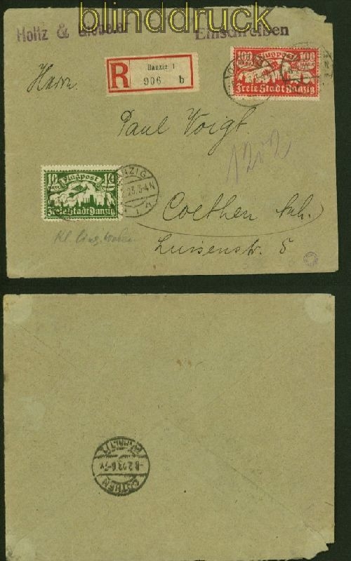 Danzig Mi # 117 und 135 MiF R-Brief Danzig 1923 10 Mark Flugpostmarken (III) mit Wasserzeichen 3 Y in Mischfrankatur MiF mit 100 Mark dunkelrose portogerecht in der Gewichtsstufe 20 bis 100 gr. auf Firmen-Bedarfsbrief aus Danzig 6.2.1923 nach Coethen Umschlag dreiseitig geöffnet und oben rechts mit Spuren geprüft Infla Berlin Erhaltung siehe Scan