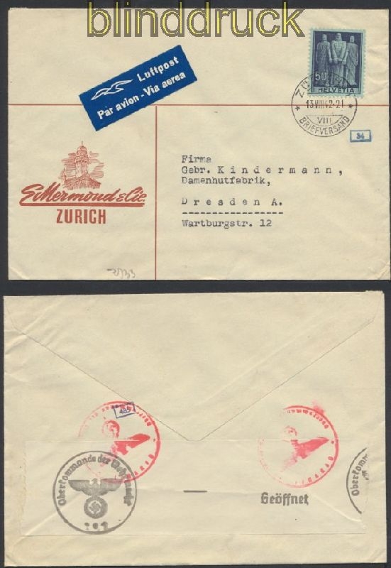 Schweiz Auslands-LuPo-Zensur-Brief Zürich 1942 Deutsche Zensur mit deutscher Zensur der Auslandsbriefprüfstelle ABP Frankfurt Brief gelaufen aus Zürich 13.8.1942 nach Dresden diverse Prüfvermerke Erhaltung siehe Scan