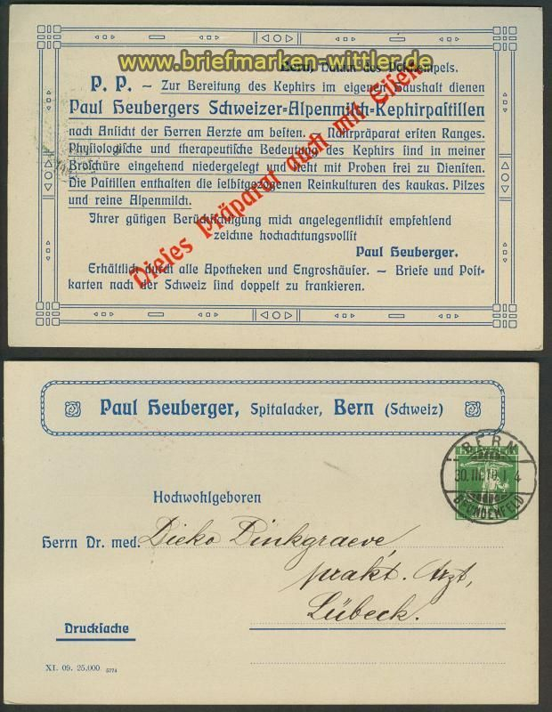 Schweiz Firmen-Privat-Ganzsachenkarte Paul Heuberger Bern 30.3.1910 als Drucksachenkarte nach Lübeck Erhaltung siehe Scan
