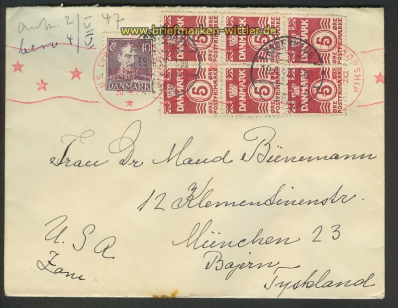 Dänemark Auslands-Zensur-Brief 1947 mit amerikanischer Zensur München Durchlaufmaschinenstempel Riemer A-27 Brief gelaufen Kopenhagen19.4.1947 nach München Rückklappe fehlt Erhaltung siehe Scan