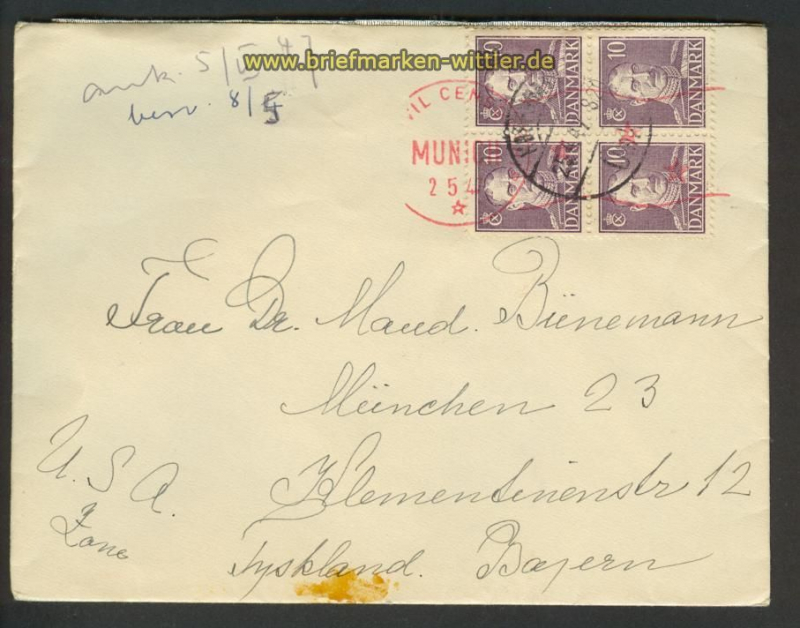 Dänemark Auslands-Zensur-Brief 1947 mit amerikanischer Zensur München Durchlaufmaschinenstempel Riemer A-27 Brief gelaufen Kopenhagen 25.4.1947 nach München Erhaltung siehe Scan