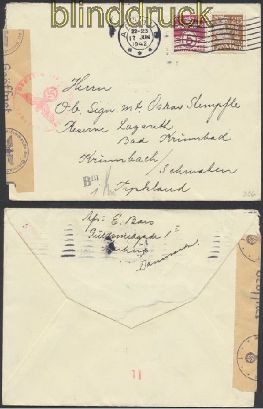Dänemark Auslands-Zensur-Brief Aarhus 1942 schöne Mischfrankatur MiF mit deutscher Zensur der Auslandsbriefprüfstelle ABP Berlin Brief gelaufen aus Aarhus 17.6.1942 nach Bad Krumbach Erhaltung siehe Scan
