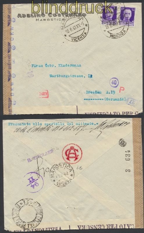 Italien Auslands-Zensur-Brief Marostica 1942 Doppel-Zensur zwei Marken 50 C. König Emanuell III MeF auf Auslands-Zensur-Brief aus Marostica 19.8.1942 nach Dresden mit italienischer und deutscher Zensur Erhaltung siehe Scan 1310