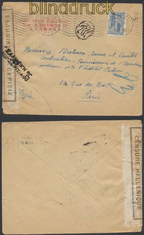 Griechenland Auslands-Zensur-Brief 1941 griechische Zensur nach Paris mit griechischer Zensur Verschlussstreifen Brief gelaufen 13.1.1941 nach Paris Erhaltung siehe Scan