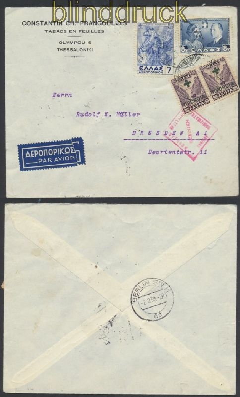 Griechenland Auslands-Zensur-LuPo-Brief 1938 griechische Zensur nach Dresden (44903)