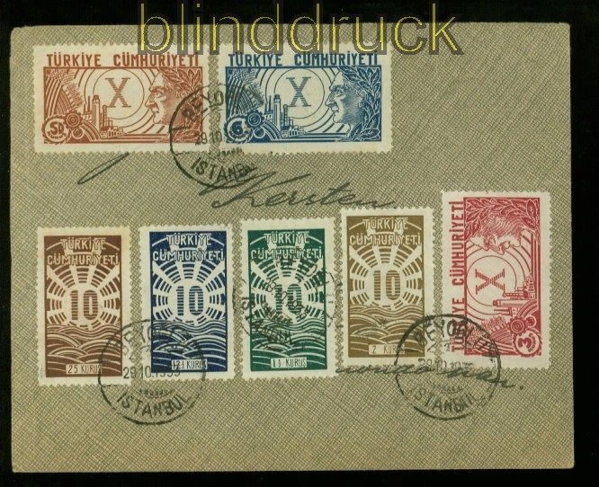 Türkei Mi # 964/70 mit Ersttagsstempel FDC Istambul 29.10.1933 10 Jahre Republik komplette Ausgabe auf Blanko-Ersttagsbrief FDC BEYOGLU Istambul 29.10.1933 Umschlag rechts senkrecht gefaltet Erhaltung siehe Scan