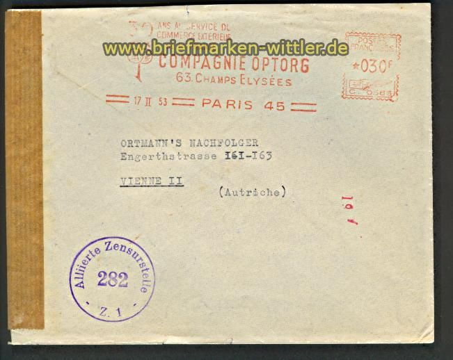 Frankreich Auslands-Zensur-Brief Paris 17.2.1953 nach Österreich freigemacht mit Freistempler
