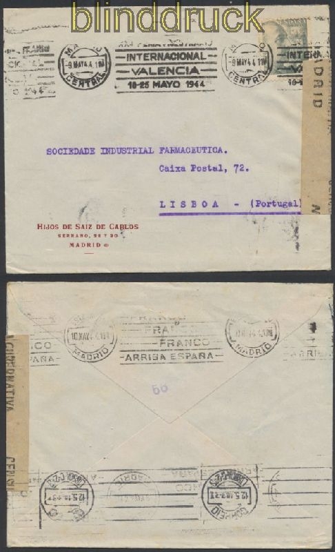 Spanien Auslands-Zensur-Brief Madrid 1944 spanische Zensur nach Lissabon (44999)