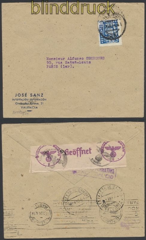 Spanien Auslands-Zensur-Brief Valencia 1944 Doppel-Zensur mit spanischer Zensur die deutscher Zensur ist von der seltenen ABP Nancy Brief gelaufen aus Valencia 3.4.1944 nach Paris ein Beleg mit einer besseren Zensur Erhaltung siehe Scan