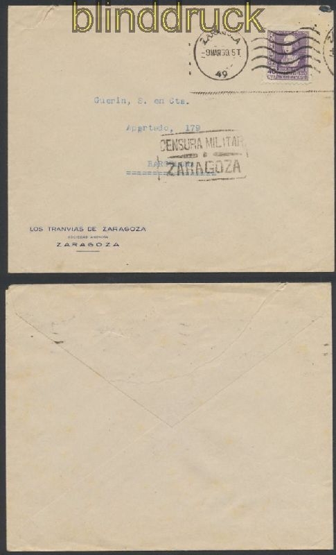 Spanien Zensur-Brief Zaragoza 1939 spanische Zensur mit spanischer Zensur aus Zaragoza Brief gelaufen aus Zaragoza 9.3.1939 nach Barcelona Erhaltung siehe Scan