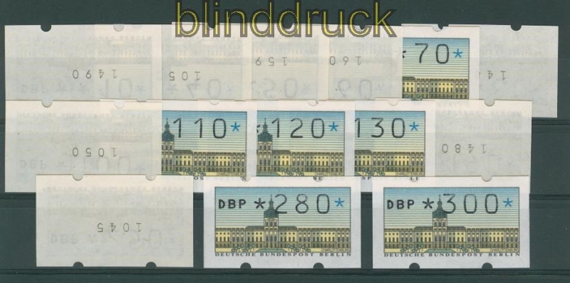 Berlin ATM Mi # 1 Tastensatz 1 postfrisch Automatenmarke Schloss Charlottenburg Tastensatz 1 komplette Ausgabe postfrisch 10, 40, 50, 60, 80, 100, 190 und 250 Pfennig mit rückseitiger Nummer Erhaltung siehe Scan