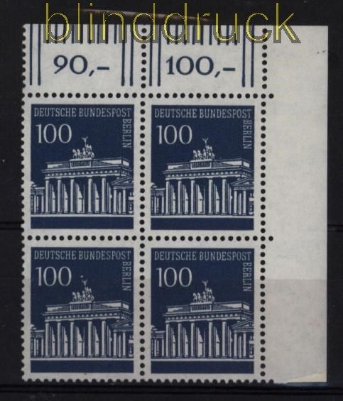 Berlin Mi # 290 Brandenburger Tor 4er-Block Eckrand oben rechts postfrisch 100 Pfg. Brandenburger Tor postfrischer Eckrand-4er-Block oben rechts Wakzendruck Erhaltung siehe Scan