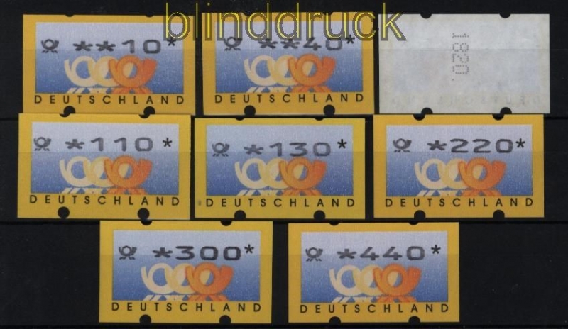 Bundesrepublik ATM 1999 Mi # 3 Type 2 Tastensatz 1 postfrisch Automatenmarken 1999 Type 2 Posthorn fett geringer Abstand zwischen den Ziffern Tastensatz 1 komplett 100 Pfg. mit rückseitiger Nummer postfrisch Erhaltung siehe Scan