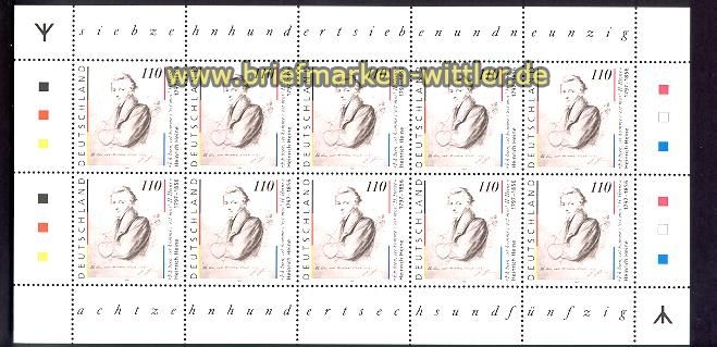 Bundesrepublik Mi # 1962 I postfrisch Heinrich Heine mit Runen Kleinbogen 200. Geburtstag Heinrich Heine kompletter postfrischer Kleinbogen Klbg hier in der Erstauflage mit Runen Erhaltung siehe Scan