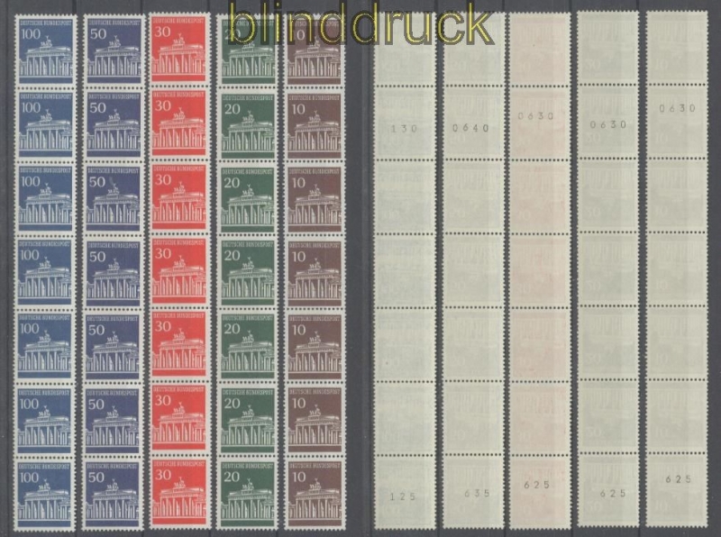 Bundesrepublik Mi # 506/10 R postfrisch Brandenburger Tor 7er-Streifen mit Nummer Brandenburger Tor Rollenmarken komplette Ausgabe senkrechte 7er-Streifen die Streifen sind an der 4. Marken gefaltet sodass zwei einwandfreie 3er-Streifen da sind postfrisch Erhaltung siehe Scan