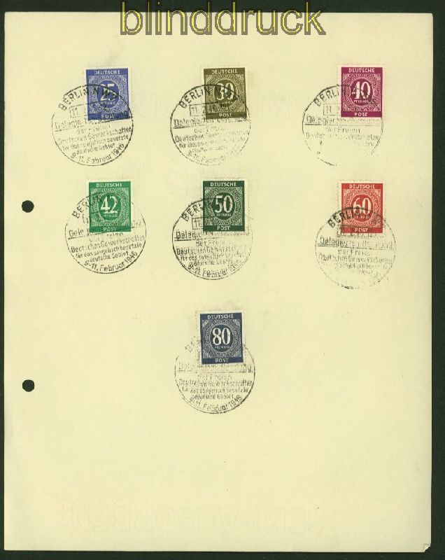 Alliierte Besetzung Gemeinschaftsausgaben Mi # 911/935 mit # 930 SSt. Berlin Vorlageblatt I. Kontrollratsausgabe mit Sonderstempel SSt. Berlin Delegiertenberatung der Freien Deutschen Gewerkschaften mit 42 Pfennig auf zwei Vorlageblättern Erhaltung siehe Scan