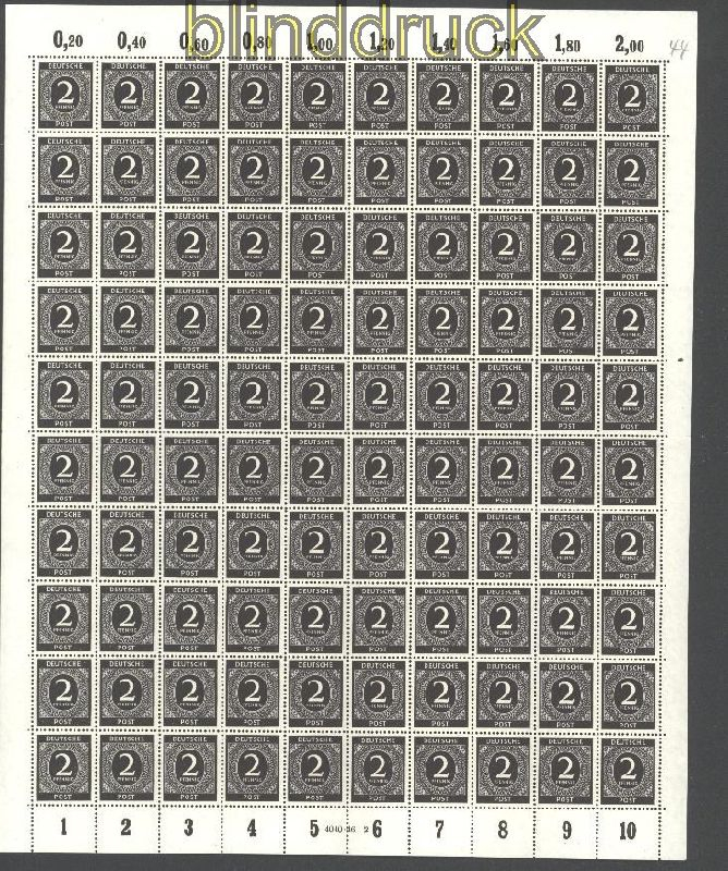 Alliierte Besetzung Gemeinschaftsausgaben Mi # 912 P ngdz kompletter postfrischer Schalterbogen 2 Pfennig Kontrollratsausgabe I kompletter Schalterbogen Plattendruck nicht durchgezähnter Rand mit Hausauftragsnummer HAN 4040.46 2 Bogen in der Mitte senkrecht und waagerecht in der Zähnung gefaltet Erhaltung siehe Scan