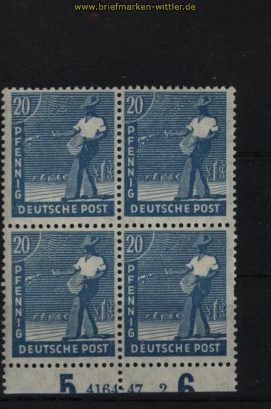 Alliierte Besetzung Gemeinschaftsausgaben Mi # 950 postfrischer 4er-Block mit HAN 4164.47 2 20 Pfg. 2. Kontrollratsausgabe mit Hausauftragsnummer postfrisch Erhaltung siehe Scan