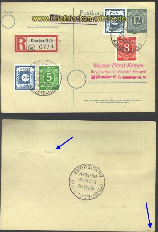 SBZ Mi # 48 A c 20 Pfennig Ziffern schwärzlichgraublau in Mischfrankatur MiF auf Orts-Einschreibe-Postkarte portogerechte Verwendung auf Kempe-Beleg farbgeprüft Ströh BPP Ankunftsstempel einwandfreie Erhaltung siehe Scan
