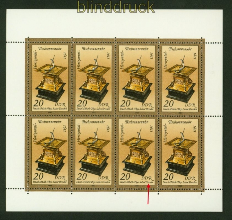DDR Mi # 2798 I postfrisch Sonnenuhr im Kleinbogen Plattenfehler (34515)