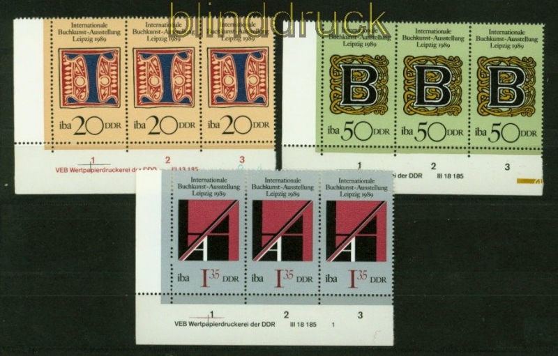 Deutsche Demokratische Republik Mi # 3245/47 Druckvermerk postfrisch Internationale Buchkunst-Ausstellung Leipzig komplette Ausgabe mit kompletten Druckvermerk postfrisch Erhaltung siehe Scan