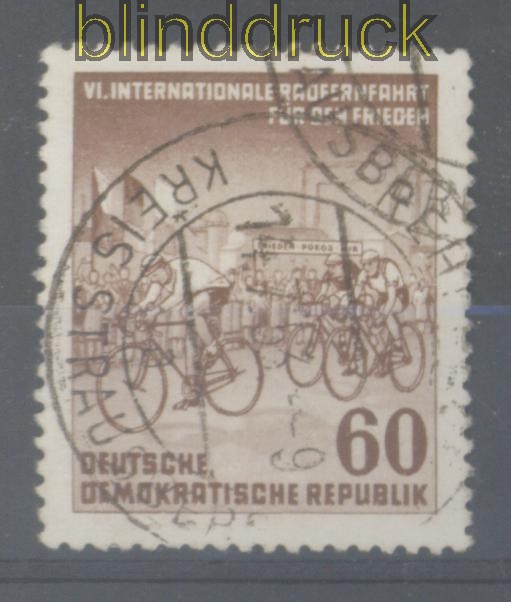 Deutsche Demokratische Republik Mi # 357 II gestempelt Radfernfahrt Plattenfehler F60 Pfg. Radfernfahrt für den Frieden gestempelt mit Plattenfehler II: D und E verbunden Erhaltung siehe Scan