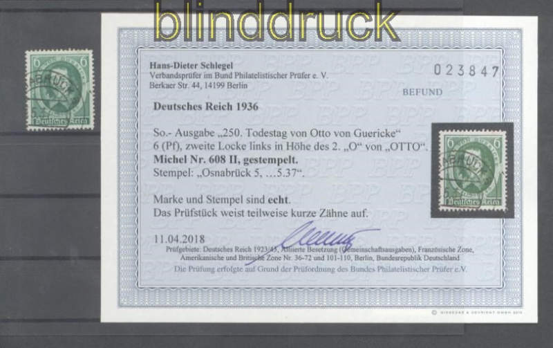 Deutsches Reich Mi # 608 I gestempelt Plattenfehler Fotobefund Schlegel BPP 6 Pfennig 250. Todestag Otto von Guericke mit dem seltenen Plattenfeghler: zweite Locke links in Höhe des zweiten O von Otto gestempelt Fotobefund Schlegel BPP: "....... Marke und Stempel sind echt, das Prüfstück weist teilweiswe kurze Zähne auf" Erhaltung siehe Scan