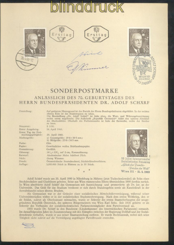 Österreich Mi # 1075 Erläuterungsblätter Unterschriften Entwerfer und Stecher Erläuterungsblätter für die Mi # 1075 70. Geburtstag Adolf Schärf komplett mit Original Unterschriften des Entwerfers Adalbert Püch und des Stechers Georg Wimmer Erhaltung siehe Scan