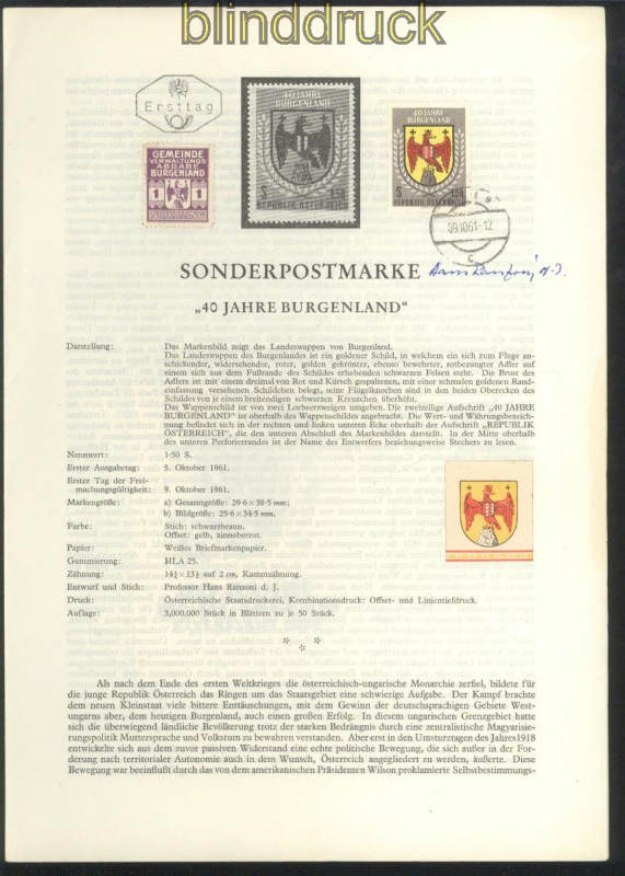 Österreich Mi # 1098 Erläuterungsblätter Unterschriften Entwerfer und Stecher Erläuterungsblätter für die Mi # 1098 40 Jahre Burgenland komplett mit Original Unterschriften des Entwerfers und Stechers Professor Hans Ranzoni d. J. zusätzlich mit Gebührenmarken Burgenland. Vignette und Ersttagsbrief FDC Erhaltung siehe Scan