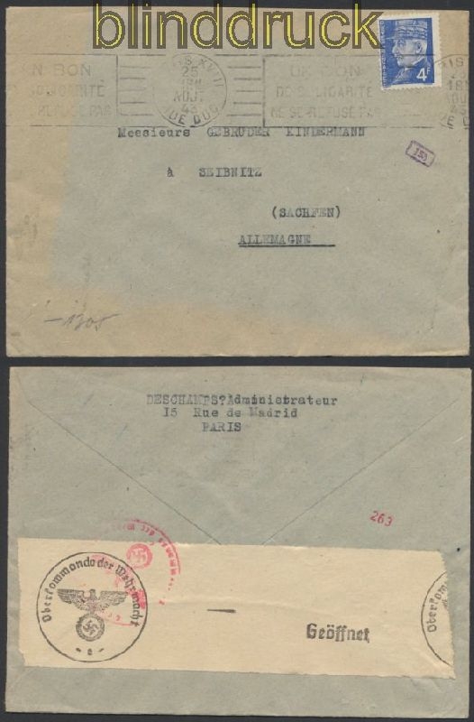 Frankreich Auslands-Zensur-Brief Paris 1943 (44891)