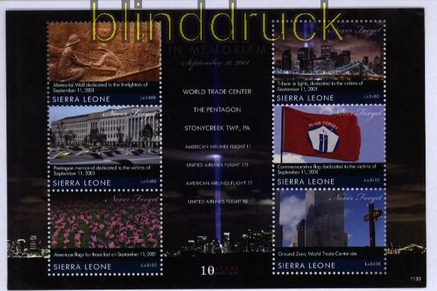 Sierra Leone 2011 Block 10. Jahrestag Attentate auf das WTC New York postfrisch Blockausgabe: 10. Jahrestag der Attentate auf das „World Trade Center“, New York postfrisch ABO-Qualität Erhaltung siehe Scan