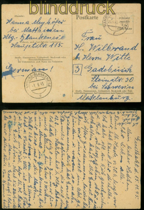 Britische Zone Behelfsausgabe GSK P 700 a gestempelt Hamburg 20.11.1945 Ganzsachenkarte Mi # P 700 a Behelfsausgabe der Britischen Zone Ganzsachekarte bedarfsmäßig gelaufen aus Hamburg 20.11.1945 nach Gadebusch Erhaltung siehe Scan