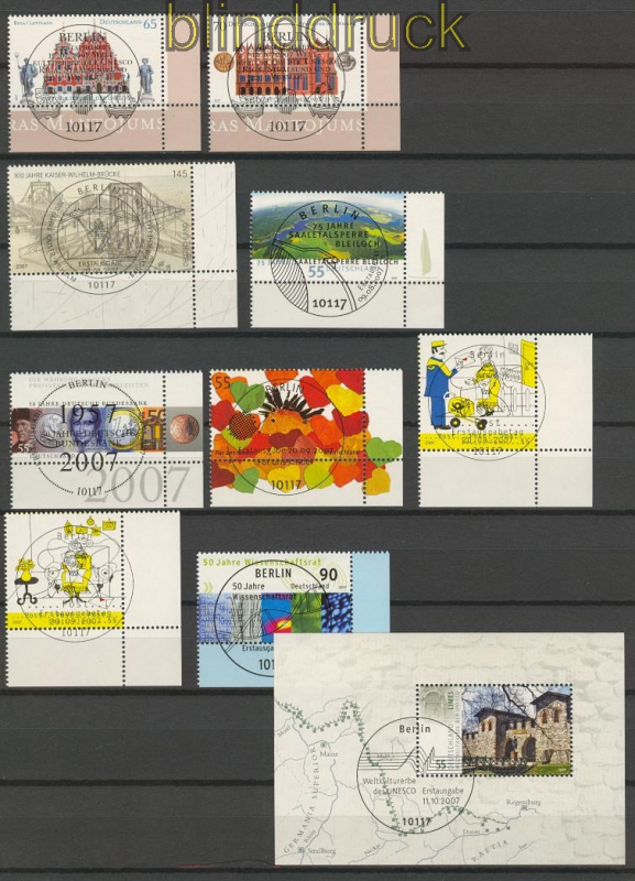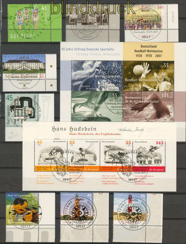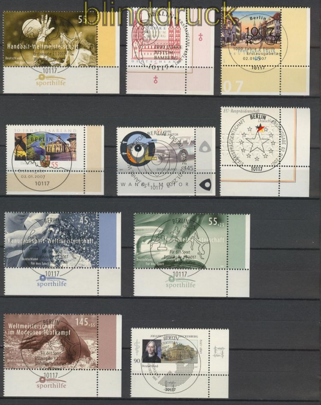 Bundesrepublik 2007 gestempelter Jahrgang mit Sonderstempel SSt. ohne selbstklebende Marken alle Marken vom Eckrand unten rechts stammt aus einem Deutschland plus ABO im Deutschland-Plus ABO gibt es keine selbstklebenden Briefmarken einwandfreie Erhaltung siehe Scan