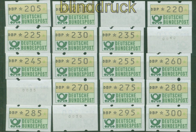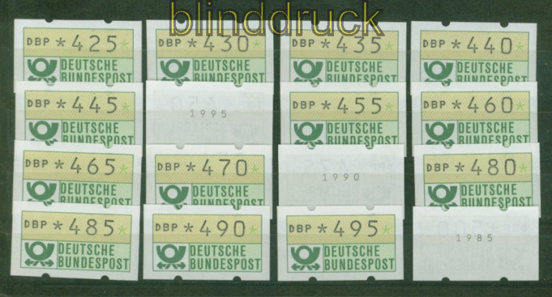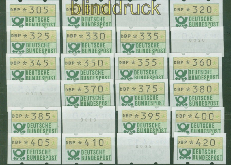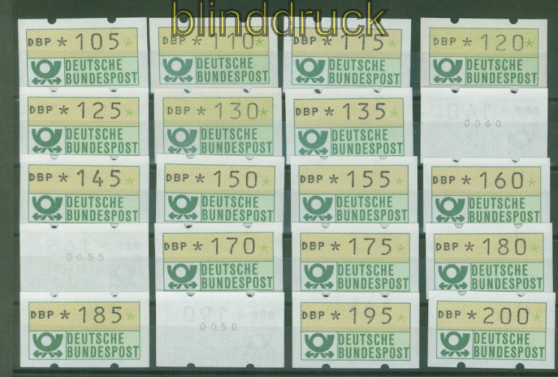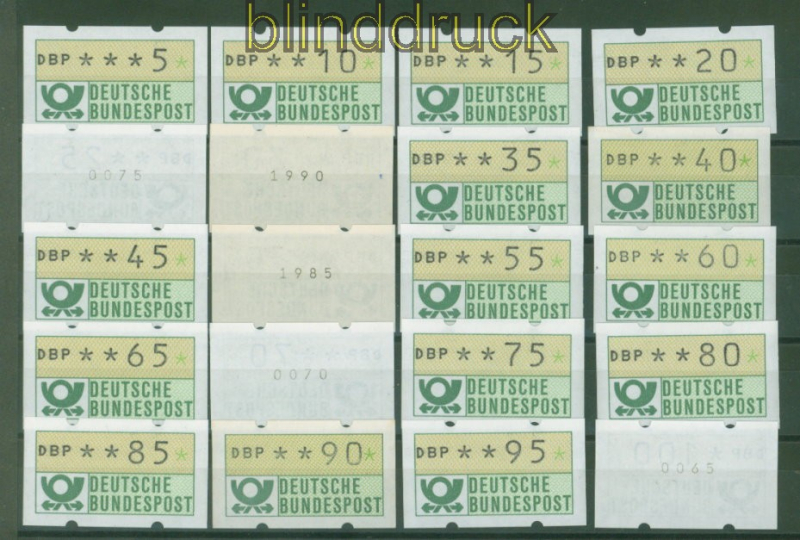 Bundesrepublik ATM 1981 Mi # 1.1 postfrisch von 5 Pfg. bis 500 Pfg. komplett in 5 Pfg. Schritten Automatenmarke Ausgabe 1981 beginnend mit 5 Pfennig in 5 Pfennig-Schritten bis zu 500 Pfennig postfrisch einige ATM sind mit rückseitiger Nummer Erhaltung siehe Scan